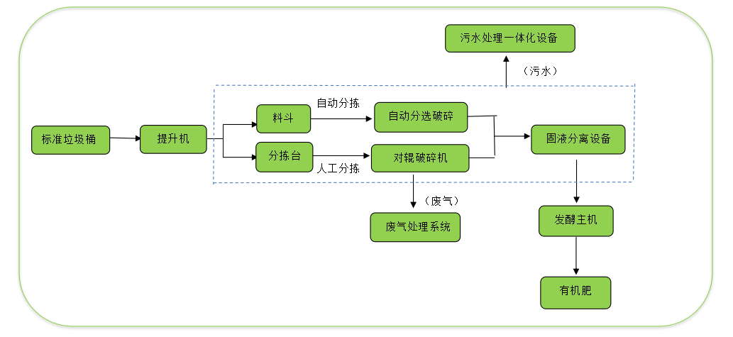 方案设计的工艺路线为:减量化、无害化、资源化处理工艺,处理中心的处理对象包括:有机垃圾处理、无机垃圾处理;有机垃圾的“三废”处理全部达标: